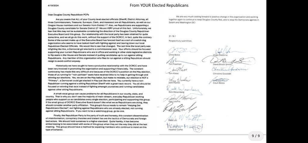 In April 2024, a letter circulated to Republican Precinct Committee Persons urging the removal of six party members who had been raising concerns about internal corruption, conflicts of interest, and alleged quid pro quo involving county and state officials. read more from the DCRCC newsletter The letter was signed by multiple elected officials—including the County Clerk.